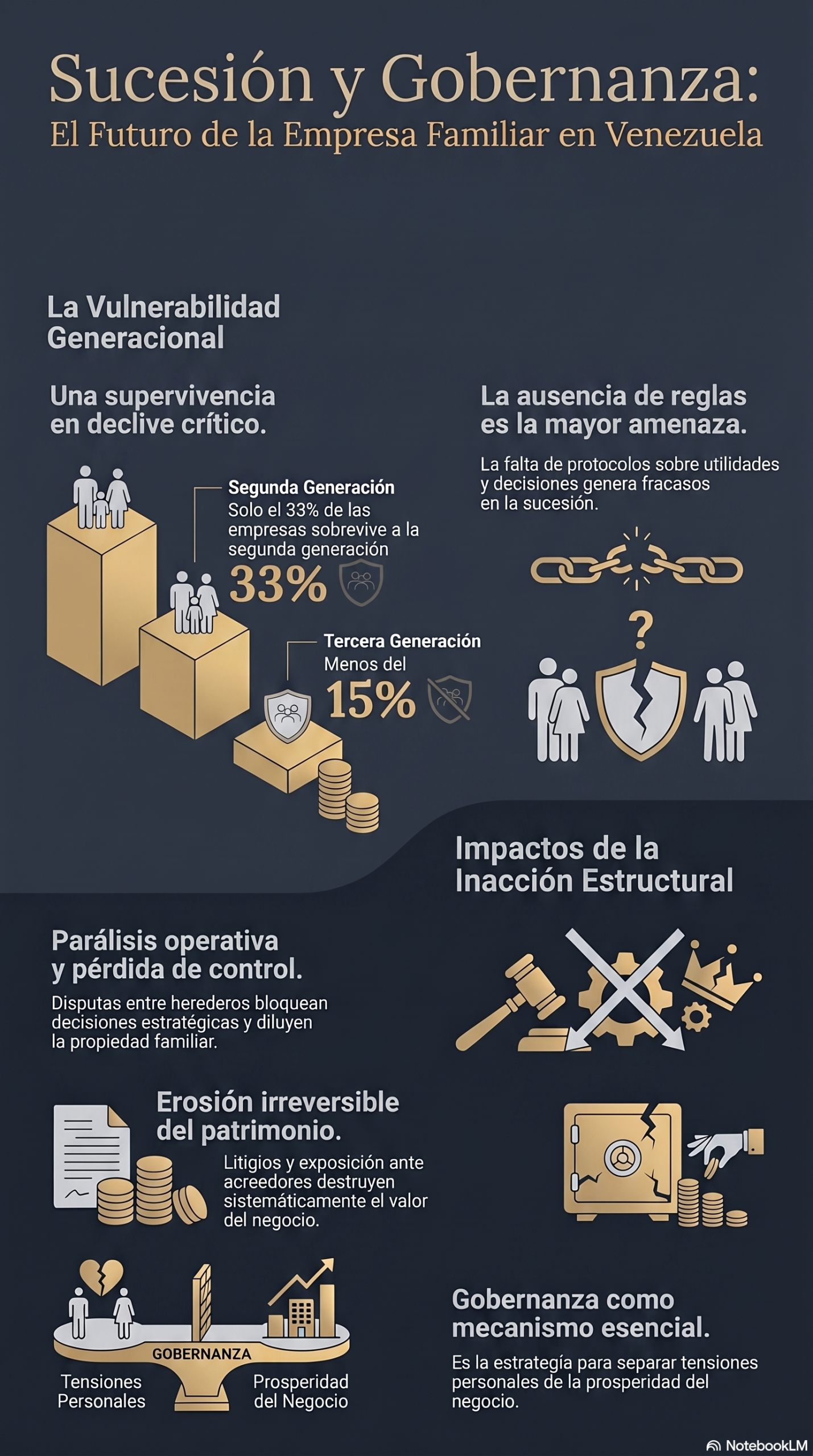 En Venezuela, la inmensa mayoría de las empresas medianas y grandes son familiares. Tras décadas de éxito y esfuerzo sostenido, muchos fundadores y sus descendientes enfrentan una amenaza silenciosa pero devastadora: la ausencia de una gobernanza clara transforma la sucesión en un punto de ruptura que puede destruir el valor de la organización. Datos de la IFER (International Family Enterprise Research) indican que solo alrededor de un tercio de las empresas familiares sobrevive a la transición a la segunda generación, y menos del 15% llega a la tercera.